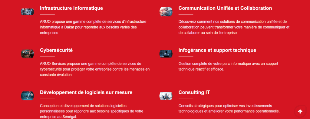 Description : Basée à Dakar, Aruo Services est spécialisée dans la transformation digitale et la cybersécurité. L’entreprise propose des solutions innovantes dans les domaines tels que la protection des données et l’optimisation IT, tout en mettant l’accent sur une approche centrée sur le client.